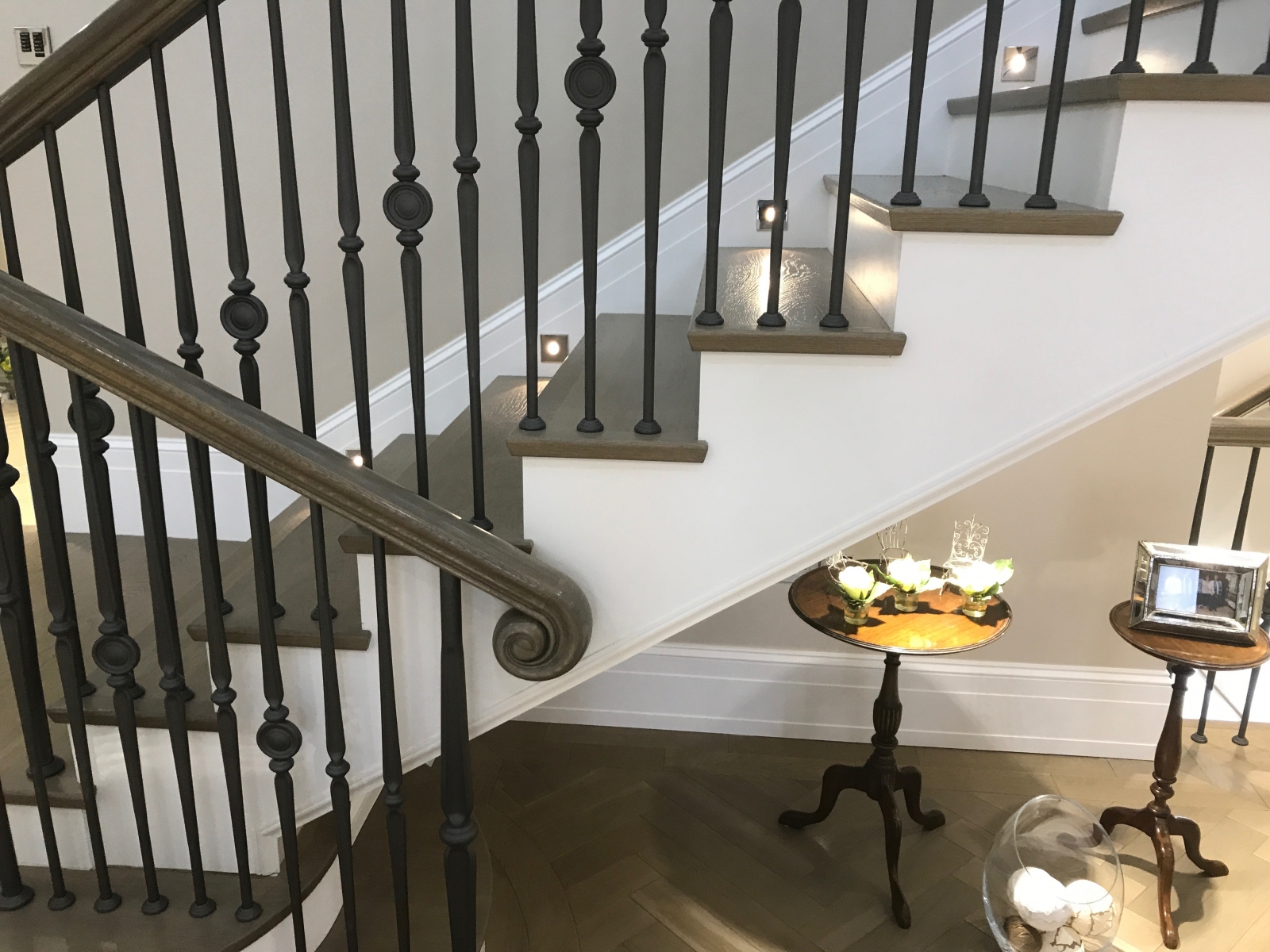 2 Different Bespoke Stair Cases Smoked Stain White Grey Lacquer